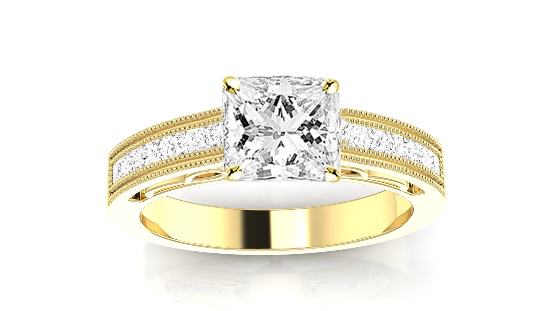 1.38 Carat 14K Yellow Gold Channel Set Princess Cut Diamond Engagement Ring with Milgrain with a 1 Carat Moissanite Center