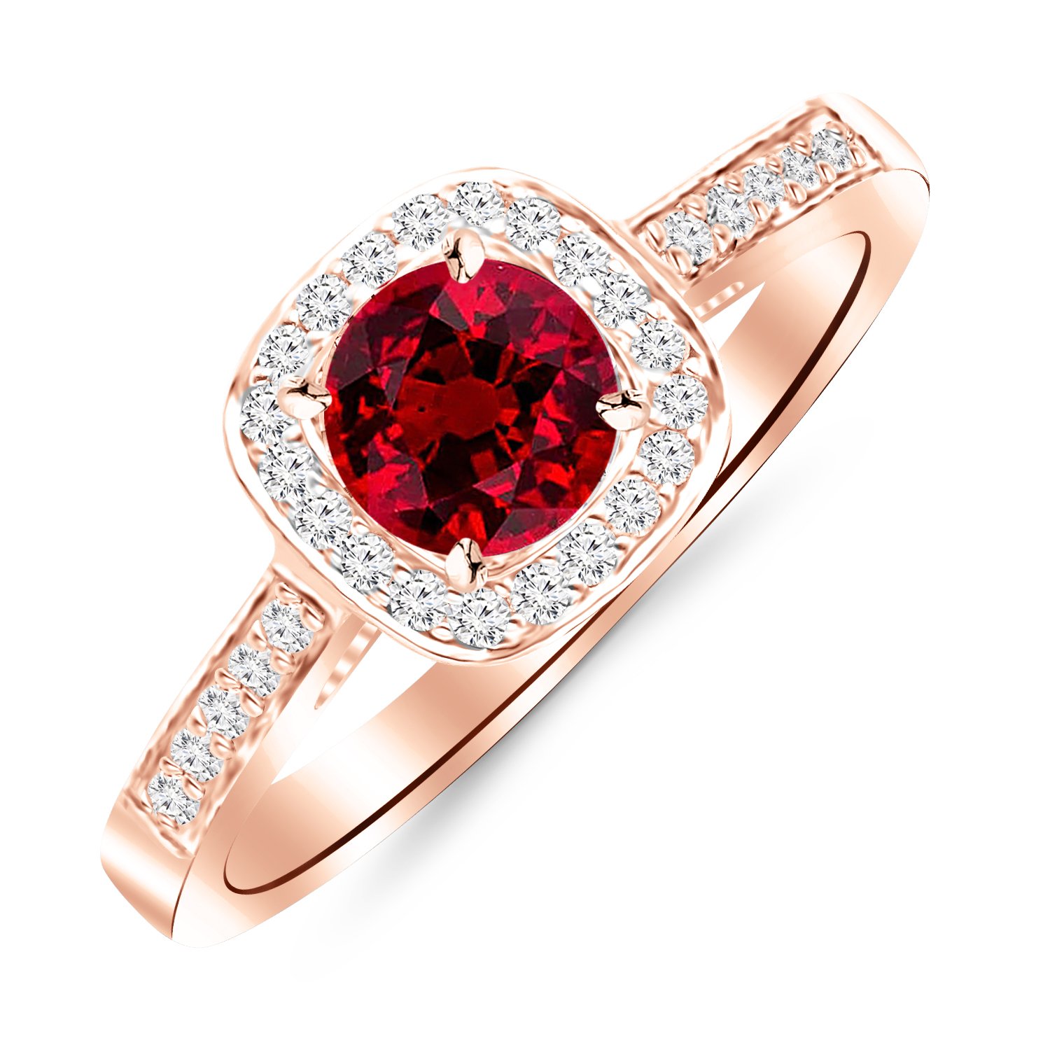 14K Rose Gold Classic Square Halo Single Row Pave Set Diamond Engaement Ring with a 0.75 Carat Ruby Heirloom Quality Center