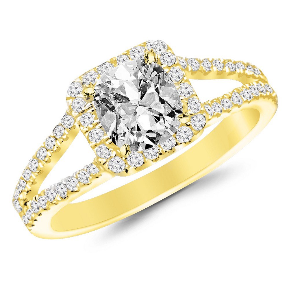 14K Yellow Gold 2 Carat LAB GROWN DIAMOND Halo Style Double Row Pave Set Designer Cushion Cut Diamond Engagement Ring (E-F Color VS2-SI1 Clarity 1.5 Ct Center)