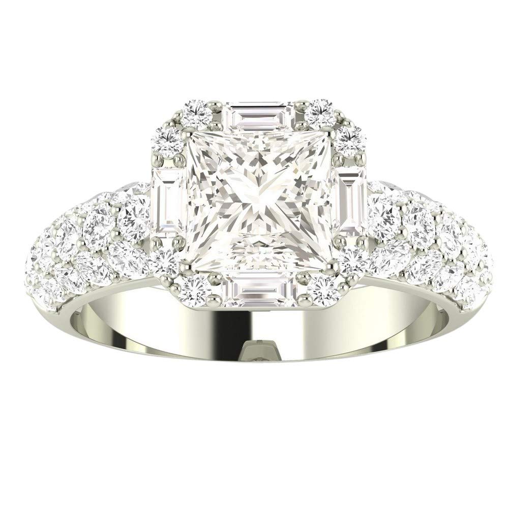 14K White Gold 1.5 Carat LAB GROWN DIAMOND Designer Popular Halo Style Baguette And Pave Set Round Princess Cut Diamond Engagement Ring (E-F Color VS2-SI1 Clarity 0.75 Ct Center)