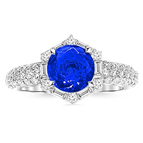 2.51 Carat Hexagonal Contemporary Halo Round And Baguette Sapphire Diamond Engagement Ring in 14K White Gold