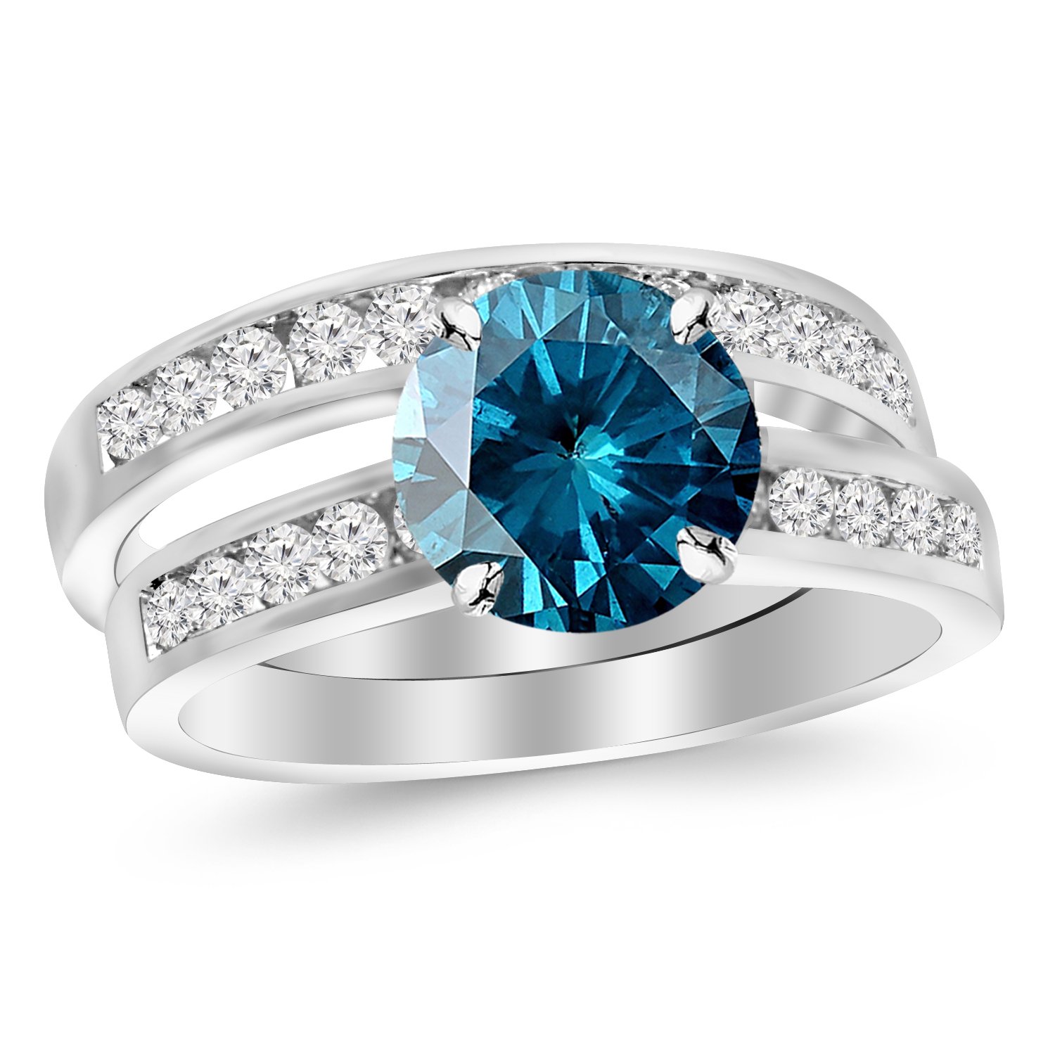 14K White Gold Classic Channel Set Wedding Set Bridal Band & Diamond Engagement Ring with a 2 Carat Blue Diamond Heirloom Quality Center