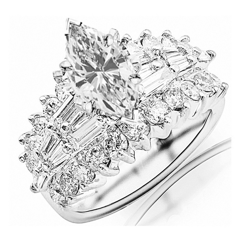 14K White Gold 5 Carat LAB GROWN DIAMOND Exquisite Prong Set Bageutte And Round Marquise Cut Diamond Engagement Ring (G-H Color VS2-SI1 Clarity 3 Ct Center)