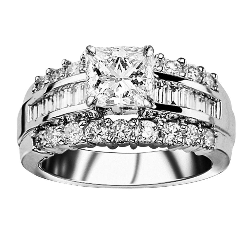 4 Carat Classic Lab 10K White Gold Synthetic Lab Grown Princess Designer Baguette Round Channel IGI Certified Diamond Engagement Ring (3 Ct, H-I Color, VS1-VS2 Clarity Center)