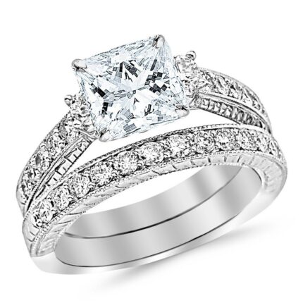14K White Gold 5 Carat LAB GROWN DIAMOND Three Stone Vintage w/Milgrain & Filigree Bridal Set W/Wedding Band & Princess Cut Diamond Engagement Ring (E-F Color VS2-SI1),size:7